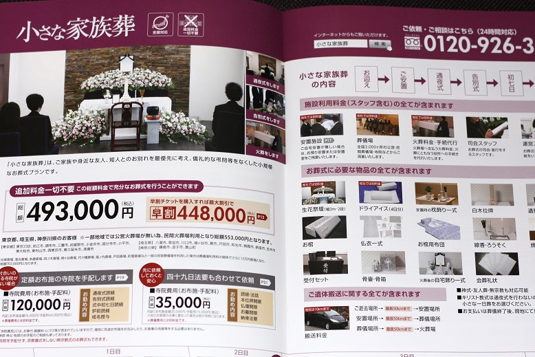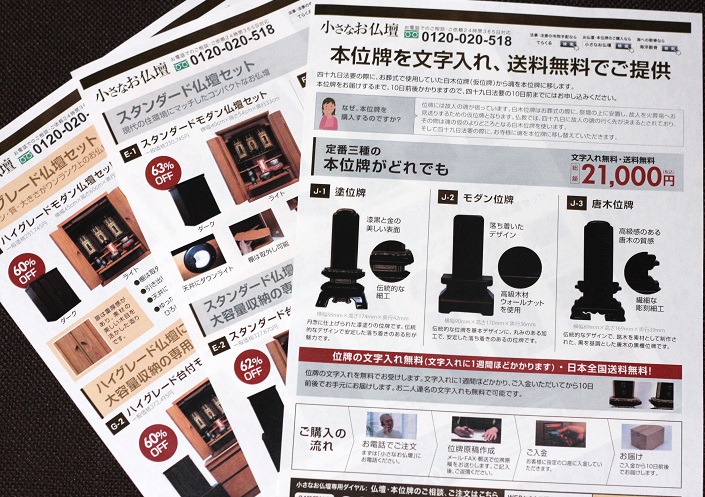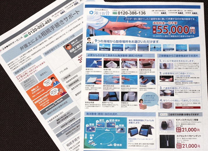 その他「位牌」「仏壇」「海洋散骨」「弁護士による相続手続きサポート」等が同封されていました。
