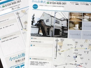 プランは3つあります。 「小さな火葬式」 故人が高齢で親はもちろん兄弟・友人もほとんど亡くなっていて、お葬式にお呼びする人が少ない場合に最適なプランで、式を行わず火葬のみ行います。 「小さな一日葬」 大袈裟なお葬式はしたくないが、火葬だけでは偲びなのできちんと儀式をして故人を送り出したいとお考えの方に最適なプランで、告別式と火葬を行います。 「小さな家族葬」 ご近所の方や親戚・仕事関係の方も少しお呼びして、お葬式はできるだけ費用を抑えて行いたい場合に最適なプランで、一般的なお葬式を小規模で行います。 最後に資料請求で最も気になる営業電話ですが、住所の確認なども含めて一切ありませんでした。 |