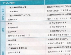 小さなお葬式の資料を請求してみました。 私の父親(83歳)が脳梗塞で倒れ、医者には今後意識の回復は難しいと言われ、真剣に葬儀のことを考えなくてはならなくなりました。 今まで父親は普通に元気だったため葬儀については漠然としかイメージしていませんでした。 しかし、このような状況となり、いざとなった場合の葬儀社を決めておく必要があり、資料を請求することにしました。 WEB上で入力するのは「名前・送付先」と「資料送付方法を選択・葬儀をお考えの地域の選択」。 たったこれだけです。 日曜日の夜にWEB請求し、木曜日には担当者の名前が入った挨拶文と一緒に資料が届きました。 WEB上ではわからないさらに詳しい、斎場などの具体的な内容の資料でした。 内容を確認中に「火葬中の待ち時間はどのように過ごすのか?」という疑問がわき、「待合室は別途有料」となっていたので早速電話で問い合わせてみました。 電話応対の方は男性でしたが、とてもゆっくりと話してくれて、年配の方にもわかりやすそうで好印象です。 待ち時間についてですが、最近は近くのファミレス等で過ごされる方が多いそうです。 待合室を使用する場合は椅子一脚いくらと計算するようです。また食事を取ることもできます。 金額は地域、斎場によって異なるようですので確認されるとよいと思います。 参考までに私の地域では椅子4~500円、食事一人3500円とのことでした。 |